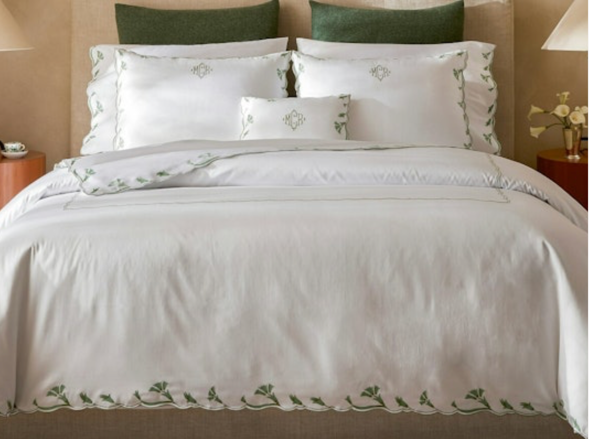 This delicate embroidered collection on luminous Nocturne sateen features elongated, scalloped florals whose tonal shifts lend depth and dimension to this classic look. Without any visible stitching, the trim drapes seamlessly—offering a sense of softness and sophistication to the bed.